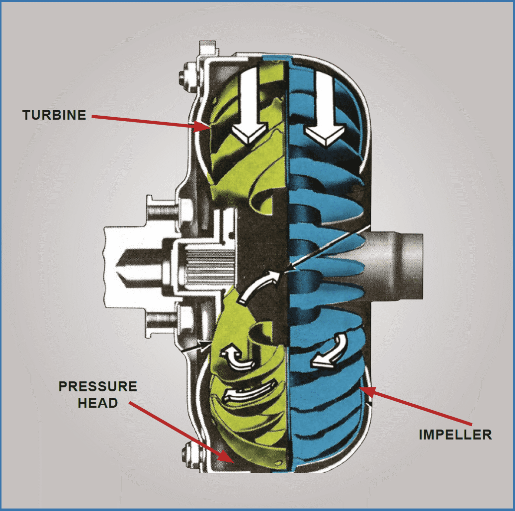 The torque converter housing is a doughnut shaped sealed unit. Inside the housing are two large ‘fans’ (the impeller and the turbine), a smaller ‘fan’ (the stator) and oil (torque fluid). The housing and impeller are attached to the flywheel and always spin at the same speed as the engine. The turbine is connected to the automatic transmission. As the impeller rotates, it forces the oil to the outside (by means of centrifugal force) and onto the fins of the turbine which causes it to spin and rotate the transmission.